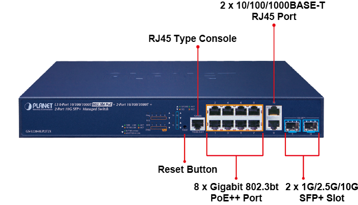 PLANET GS-5220-8UP2T2X è uno Switch Gigabit managed IPv4/IPv6, dotato di 8 porte PoE++ 10/100/1000BASE-T, 2 porte in rame Gigabit aggiuntive e altri 2 slot SFP+ 1/10 Gigabit BASE-X. Ciascuna delle otto porte Gigabit fornisce 75 watt su cavo UTP a 4-coppie, per una potenza complessiva di 240 watt. Le due porte 10G SFP+ supportano transceiver 10GBASE-SR/LR o 1000BASE-SX/LX, permettendo all’amministratore di rete si scegliere il modulo SFP/SFP+ in base alla distanza o velocità di trasmissione richiesta per estendere la rete in modo efficiente.