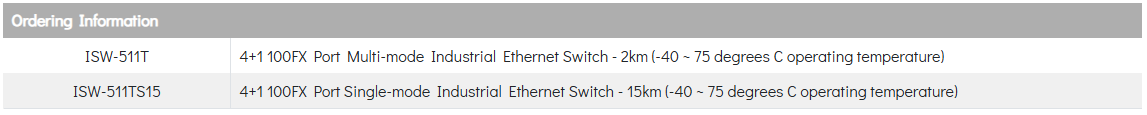 Dotati di 4 porte 10/100Mbps con funzionalità auto MDI / MDIX e una interfaccia SC in fibra ottica 100Base-FX, ISW-511T e ISW-511TS15 forniscono switch fabric non-blocking 1Gps e tabella MAC 2K e permettono di eseguire il trasferimento di pacchetti wire-speed senza rischio di perdita di pacchetti. Alloggiati in uno chassis compatto in metallo, con grado di protezione IP30, rappresentano una soluzione ideale per le industrie pesanti.