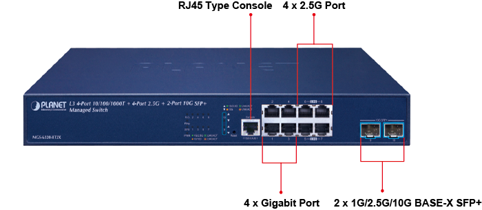 PLANET MGS-6320-8T2X è uno switch multigigabit completamente gestito progettato per soddisfare le esigenze di apparecchiature di rete ad alta larghezza di banda, come AP wireless Wi-Fi 6 802.11ax, NAS, workstation e dispositivi con interfacce 2.5GBASE-T. È dotato di 4 porte in rame 10/100/1000BASE-T, 4 porte in rame 100/1000/2500BASE-T e 2 porte in fibra 1G/2.5G/10GBASE-X SFP+, progettate in modo flessibile per estendere la distanza di connessione. Grazie a una capacità di collegamento dati così favorevole, prestazioni di routing Layer 3 basate su hardware, motore di commutazione Layer 2 e Layer 4 e interfacce di gestione IPv6/IPv4 intuitive ma avanzate, contribuisce ad accelerare l’implementazione della rete IoT e wireless di nuova generazione per aziende e smart city.