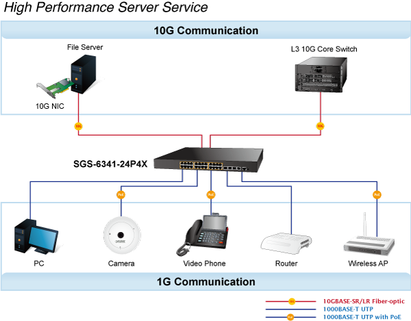 SGS-6341-24P4X offre una struttura switch non bloccante a 128 Gigabit al secondo, consentendo di fornire facilmente una rete Ethernet locale ad alta larghezza di banda da 10 Gbps per la dorsale del vostro reparto. Grazie alle quattro porte SFP+ integrate, SGS-6341-24P4X fornisce l’uplink alla rete dorsale tramite i moduli SFP+ LR/SR Ethernet 10G. Migliora ulteriormente l’efficienza della rete e protegge i client di rete offrendo funzionalità di sicurezza e QoS.